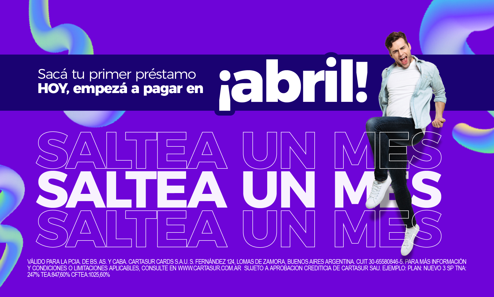 El otorgamiento del préstamo personal se encuentra sujeto a calificación crediticia y condiciones de contratación. La Tasa Nominal Anual (TNA), la Tasa Efectiva Anual (TEA) y el Costo Financiero Total Efectivo Anual (CFTEA) varían según el perfil crediticio del solicitante del préstamo y el plazo de financiación elegido. Monto mínimo $30.000.- máximo $4.000.000-. Plazo mínimo 1 mes, máximo 36 meses. Tasa Nominal Anual (TNA) sin IVA mínima 70.00%, máxima 393.00%, Tasa Efectiva Anual (TEA) sin IVA mínima 97.51%, máxima 2913.23%.